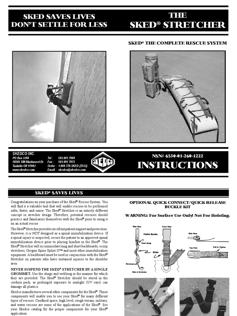 The flotation system for the sked stretcher maintains the patient in a nearly vertical position. Sked stretcher used for vertical lifting these carabiners are rated at a 9000 lb minimum break strength. The sked stretcher is a revolutionary design which provides outstanding patient protection and security. When the patient is packaged the stretcher becomes rigid. This rescue litter system is constructed out of the most durable and reliable plastic. Horizontal and vertical hoisting the sked comes equipped for horizontal hoisting by helicopter or vertical hoisting in caves or industrial confined spaces. For lifting in the vertical position, 30 ft. Northrock safety is the authorised distributor of med sled products. A variety of handles and straps allow the patient to be transported by carrying horizontally, lifting vertically from a rope system, or pulled with the harness sliding on its smooth bottom surface. The sked vertical lift sling is 30 ft. The tactical sked stretcher is designed for military operator use during combat operations. Excellent in rescues which require the unit to be dragged through a narrow space. Roco rescue director of training dennis o'connell explains the roco approved method of rigging a skedco stretcher for a vertical raise while using a backboard.